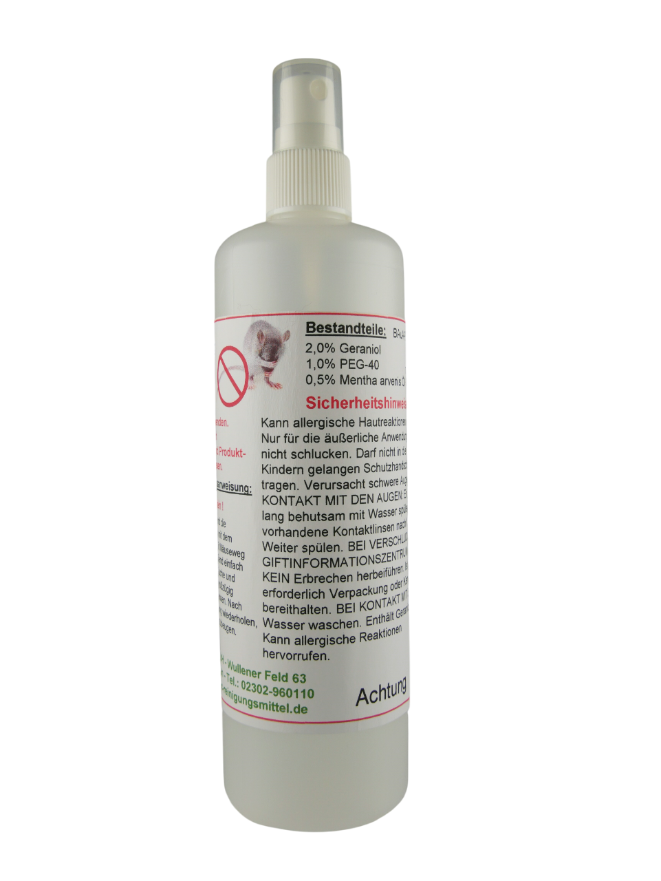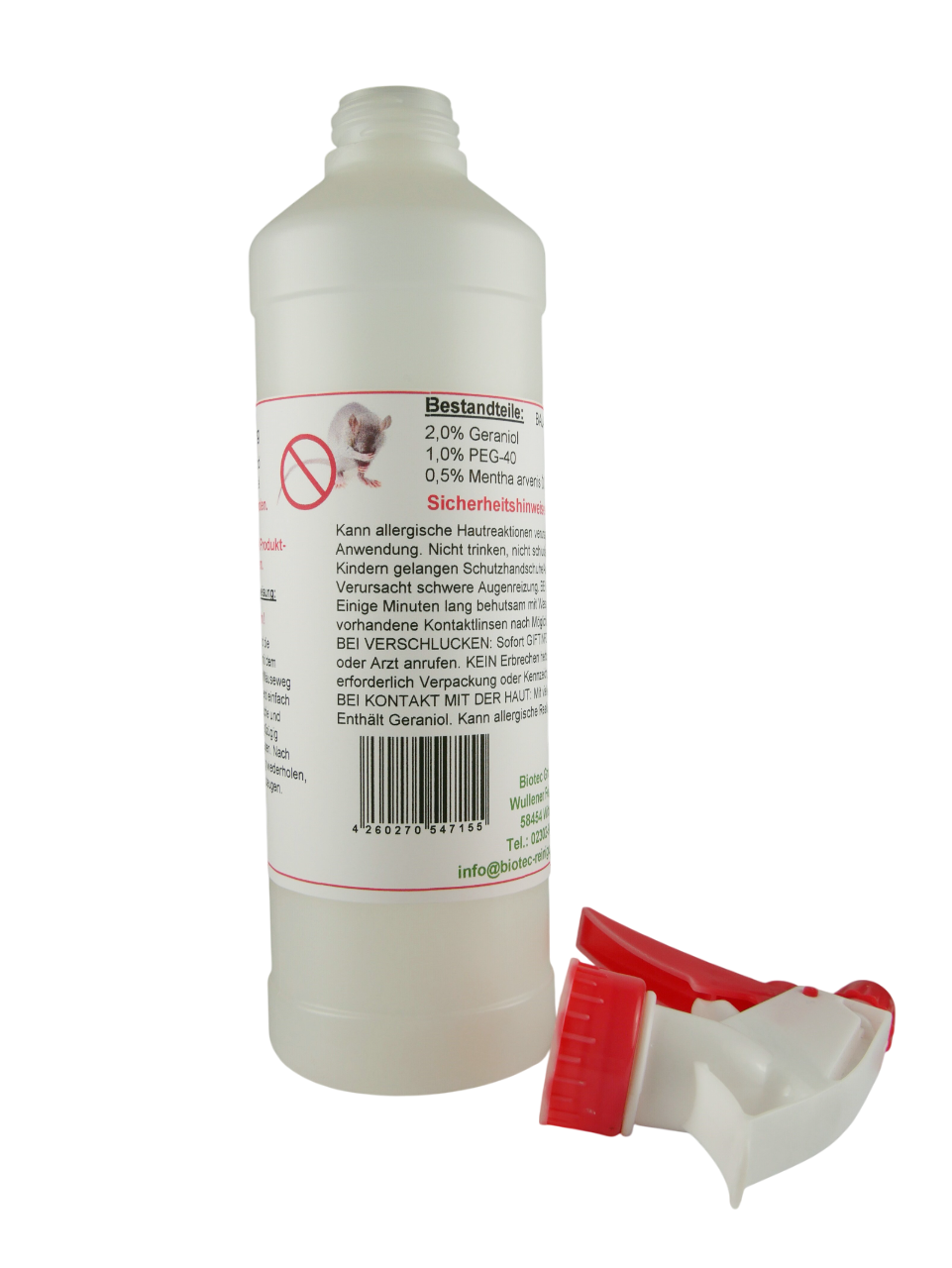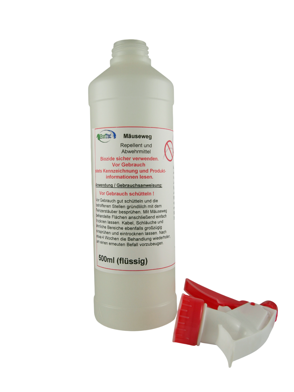Private und öffentliche Haushalte, Innen- und Außenbereiche, Industrie, Lagerräume, Biotec Mäuseweg ist ein Repellent auf Duftölbasis zur Abwehr und Vertreibung von Mäusen. Optimal geeignet für Keller, Dachböden, Garagen, Wohnwagen und andere Bereiche, die vor Mäusen geschützt werden sollten. Vor der Anwendung das Produkt gut schütteln. Die betroffenen Stellen aus einer Entfernung von ca. 30 cm großzügig besprühen. Mäuseweg beugt einer erneuten Ansiedlung vor und bietet eine anhaltende Schutzwirkung.